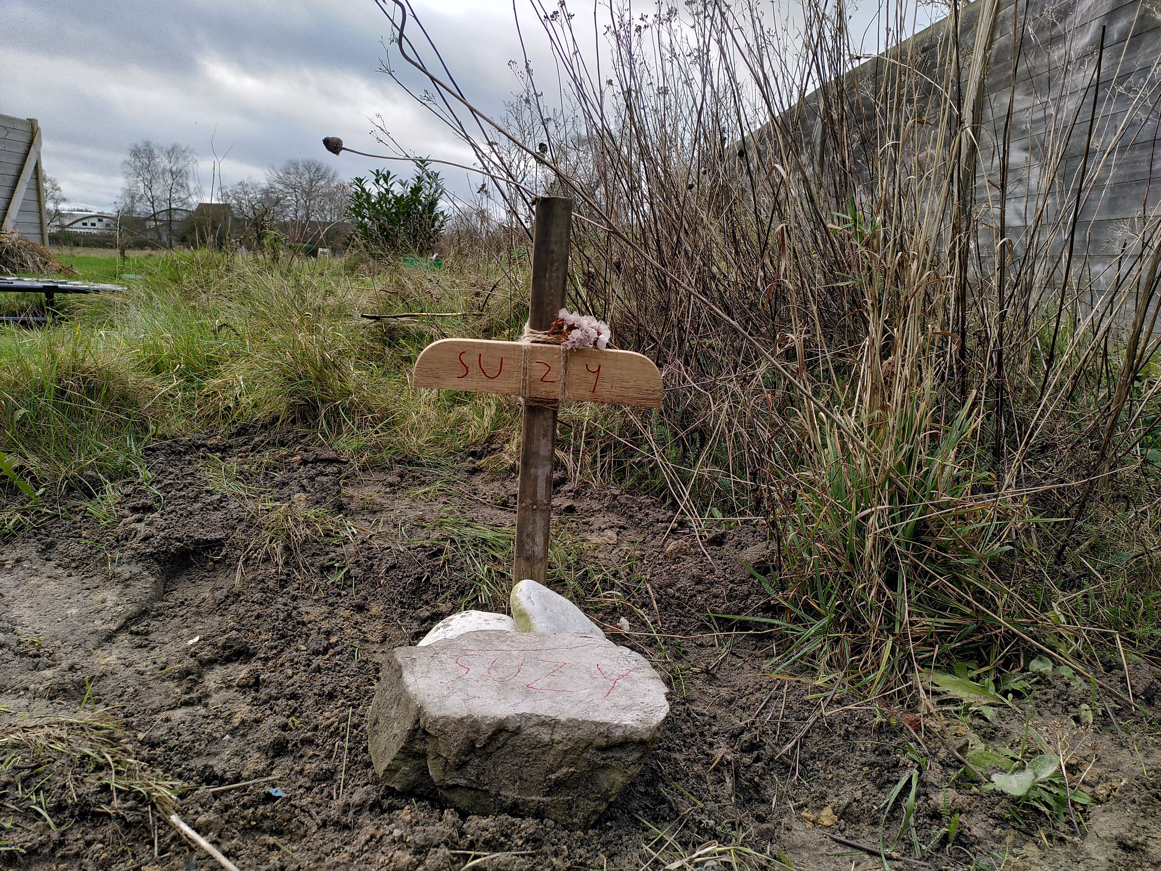 We hebben Suzy met z’n allen in de tuin begraven. Zo blijft ze toch nog dicht bij ons. Daarna hebben we samen cake gebakken (en opgegeten) en thee gedronken, op haar en op onze tijd samen