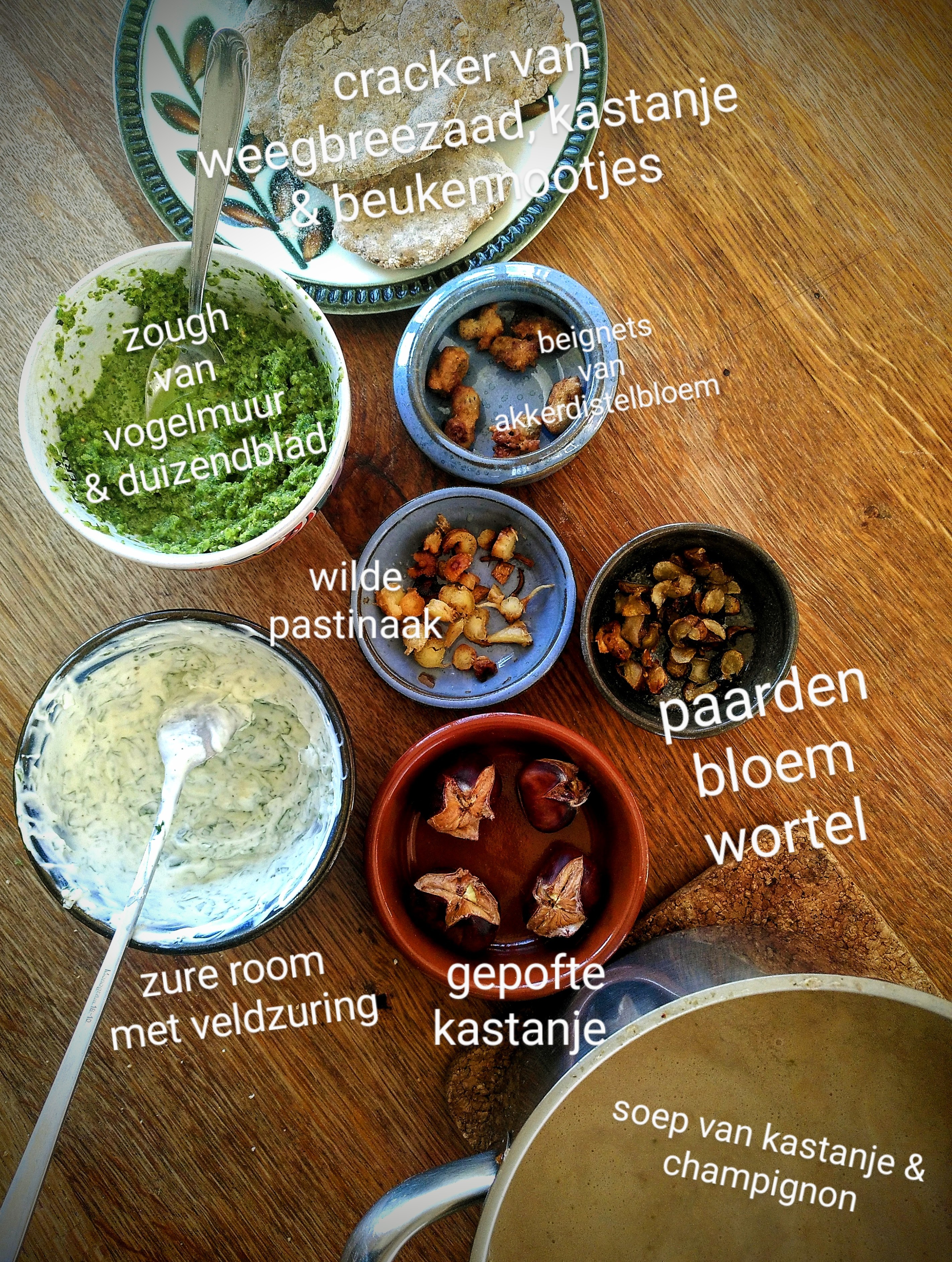 We maken en proeven o.a. weegbreesoep, brandnetelkaviaar, zadencrackers, meidoornketchup, lijsterbeschutney, zure room met veldzuring, sleedoornolijven,…